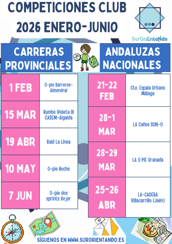 De enero a junio participaremos en pruebas provinciales y andaluzas/nacionales de múltiples modalidades: desde sprints hasta raids y carreras de bosque que nos permitirán disfrutar de terrenos y mapas muy variados. Un semestre perfecto para seguir aprendiendo, competir y disfrutar en cada carrera.